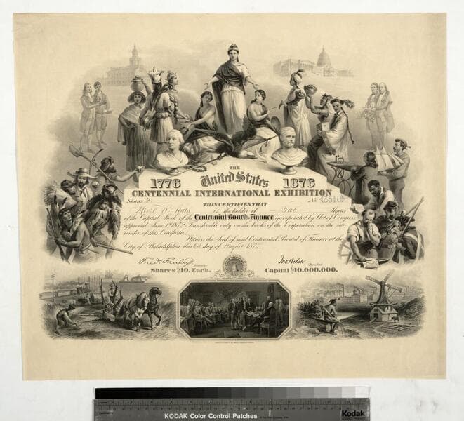 Image of a United States Centennial Exhibition stock certificate with the goddess Columbia at top center surrounded by muses and women in ethnic costumes bearing gifts; an American eagle is flanked by bust sculptures of Presidents George Washington and Ulysses S. Grant at center; working men and Native American Indians portrayed at left to represent 1776; soldiers, and African American man reading, a man with a sewing machine, and a sailor holding a model sailboat at left to represent 1876; three historical vignettes along the bottom portraying a farming scene with machinery, a train, and a steamboat, the signing of the United States Declaration of Independence, and a scene with a windmill and an American Indian man sitting on a log with smoking factories in the background; seal of the Centennial Board of Finance at lower center; certificate is signed by Centennial Board of Finance president John Welsh and treasurer Frederick Fraley.