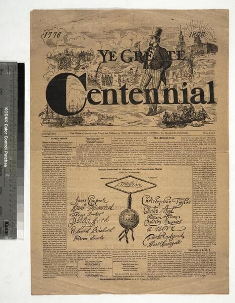 Image of the specialty newspaper Crotzer's Centennial, which contains coverage of the United States Centennial Exhibition held in Philadelphia, Pennsylvania, in 1876; contrasting vignettes of Revolutionary War soldiers in 1776 and a peaceful and prosperous landscape in 1876 at top center on page 1; images of the exhibition buildings in Fairmount Park throughout the newspaper; "fac simile of U.S. Centennial medals" on page 8.