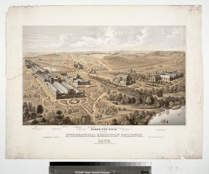 Birds eye view of the International Exhibition buildings, 1876. Fairmount Park, Philadelphia