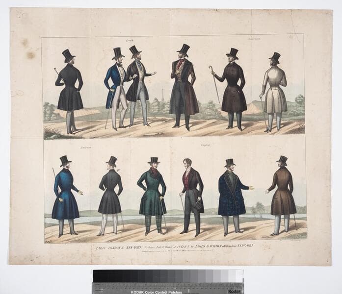 Image of six outdoor vignettes featuring men's day and evening wear; top panel captioned "French." and "American." and bottom panel captioned "American." and "English."; fashion details include cloaks, tail coats and frock coats worn with trousers or pantaloons, waistcoats, and cravats; accessories include top hats, canes, and gloves; one woman pictured in a riding habit with full skirt, jacket bodice, and a feathered hat; four children also pictured with fashion details including Orientalism, trousers, coats, a waistcoat, and a cape; reference key for figures numbered 1-20 along bottom margin.