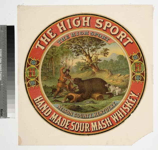 Image of a whiskey barrel label depicting a steamboat traveling along a river with "Fanny Ross" lettered on the side of the boat across the paddlewheel; image in circular embellished frame with monogram of the intertwined initials "C," "M," and "D Co." at left and right.