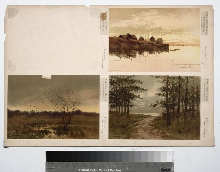 - Image of a sample book page with five watercolor landscapes (3 recto, 2 verso): cottages on the seacoast; birds in a clearing; trees along a dirt road; a man walking on a countryside path towards a lake; and a cottage on a lake with a rowboat.