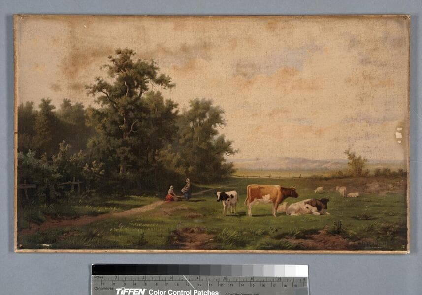- Image of a pastoral landscape with cows grazing and a pair of women with baskets walking along a path near trees.