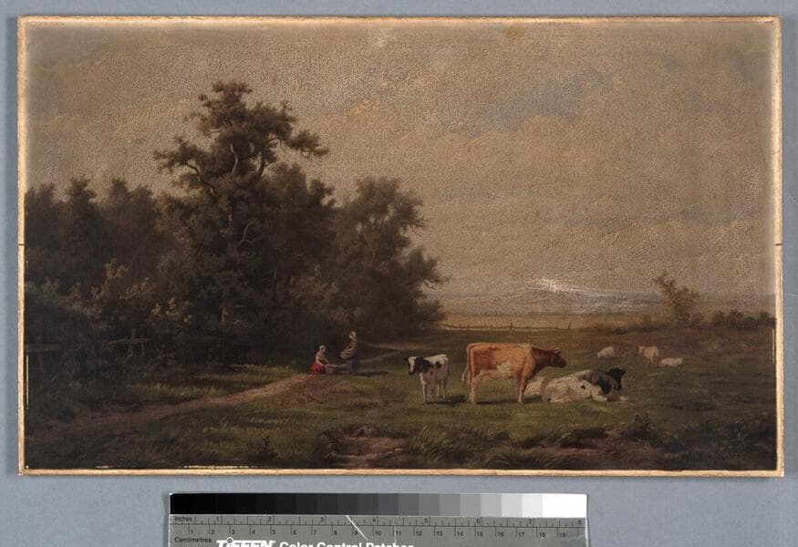 - Image of a pastoral landscape with cows grazing and a pair of women with baskets walking along a path near trees.