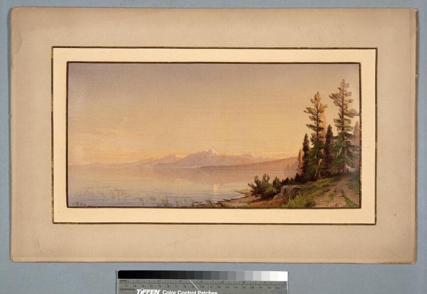 Image of a landscape view of the village of Lake George, New York, (originally known as Caldwell) on the edge of the eponymous lake; small, rocky island in a lake surrounded by mountains; small building on the island and three men in a rowboat in foreground at left; buildings on the far shore of the lake in background.