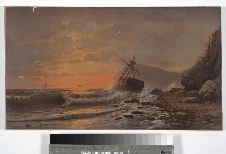 - Image of a ship near a rocky shoreline at sunset off the coast of Maine.