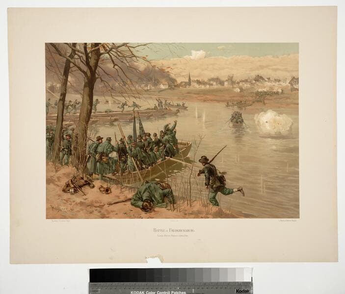 Image of the Battle of Fredericksburg, Virginia, during the American Civil War; Union and Confederate army lines engaged with wounded and dead soldiers in foreground; smoke rising from the battle along hill in background; caption describing battle in bottom margin.