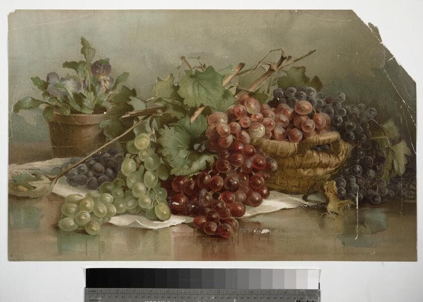 - Image of bunches of red, green, and purple grapes spilling from a basket next to a pot of flowers.