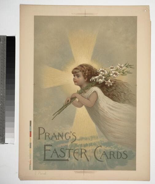 - Image of a young girl in a white dress with long blonde hair holding lilies as she floats in front of a cross of light in an advertisement for Prang's Easter greeting cards.