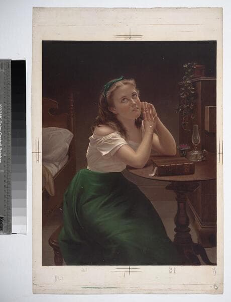 Image of an advertisement for Dr. McMunn’s kinate of quinine and cinchonine; woman sick in bed with bottles of Dr. McMunn’s kinate of quinine and cinchonine, and Dr. Munn's elixir of opium on her bedside table; another woman is seated next to the bed looking after her; girl, dog and kittens play on floor nearby; several framed pictures on wall; men work at stripping bark from trees outside the doorway.