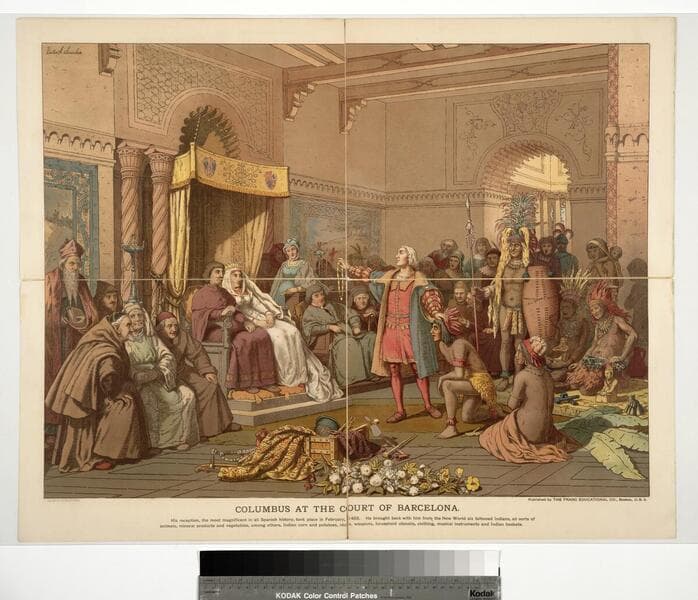 Image of an outdoor scene with explorer Christopher Columbus presenting Native Americans before the throne of King Ferdinand and Queen Isabella in Barcelona, Spain, with servants, soldiers, onlookers, and buildings in background.