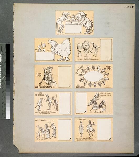 Pocket souvenir albums containing images of exhibition buildings and other miscellaneous views in and around Philadelphia, Pennsylvania, produced in commemoration of the United States Centennial Exhibition in 1876. Covers and manuscript inscriptions vary between album copies. American Centennial (Rand, McNally & Co., approximately 1876) – 1 copy Centennial (Koch Sons & Co., approximately 1876) – 1 copy Centennial Album (Centennial Album Co., ©1875) – 5 copies Centennial Album (H. J. Toudy & Co., approximately 1876) – 1 copy Centennial Exhibition and Philadelphia (approximately 1876) – 3 copies Centennial Exhibition Philadelphia (Philip Frey & Co., approximately 1876) – 3 copies Centennial Souvenir Philadelphia (Ostheimer Bros., approximately 1876) – 4 copies Memorial of the International Exhibition at Philadelphia (Thos. Hunter, ©1876) – 10 copies
