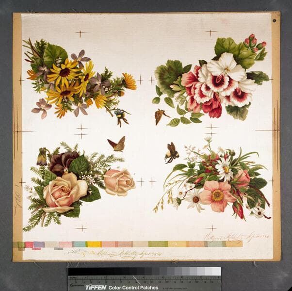 - Image of a proof sheet for four floral prints featuring a variety of flowers with bees and butterflies, including daisies and roses, printed on satin fabric.