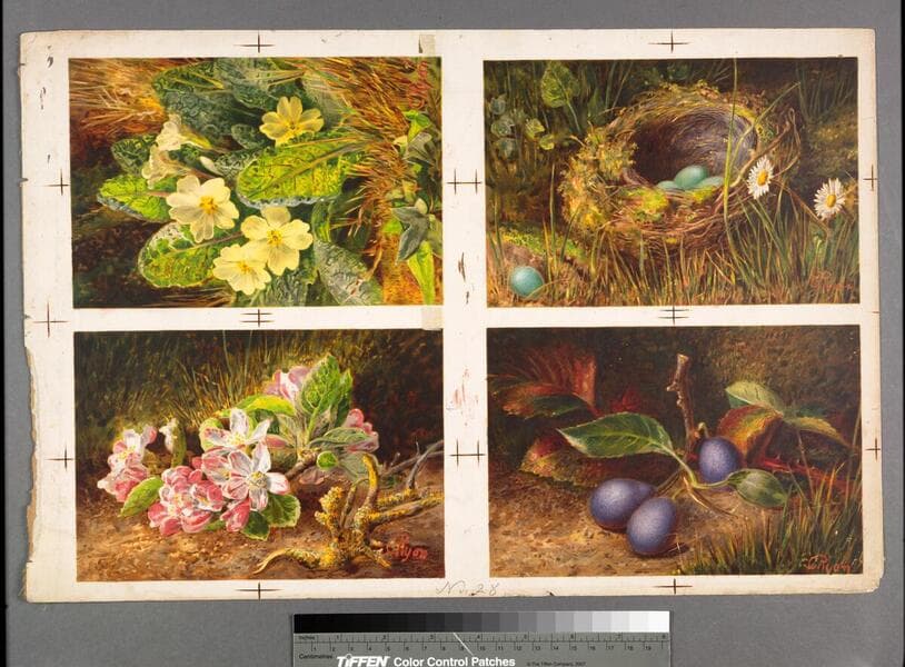 - Image of a proof sheet for four nature images of flowers, fruit, and a bird's nest with eggs.