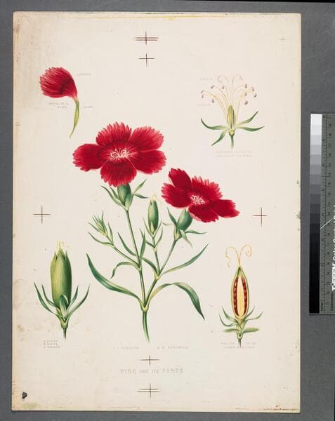Image of a rose plant with diagrams of the parts of the flower, as well as cross-sections of an apple blossom and a cherry blossom; includes captions for each diagram.