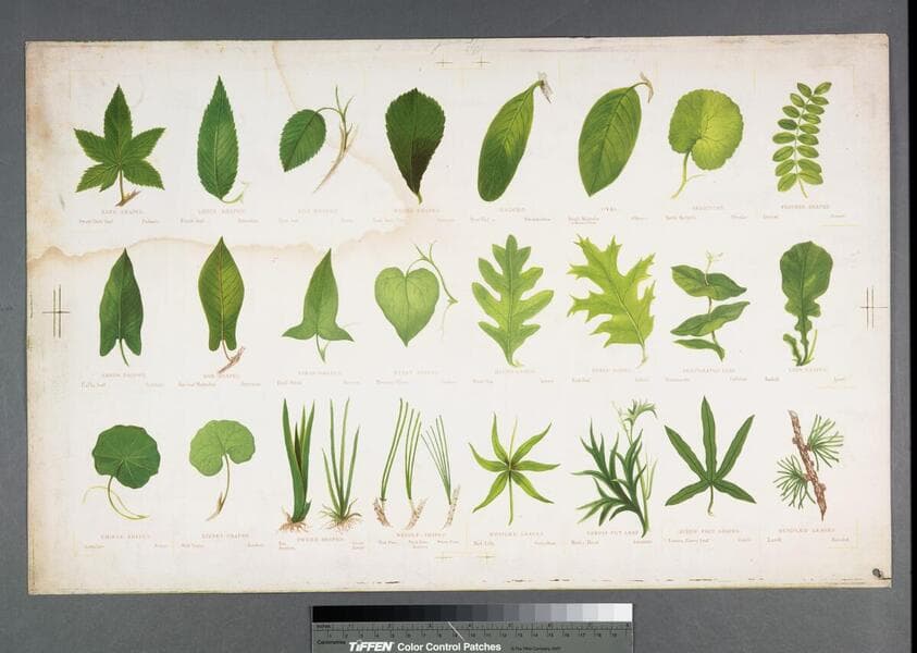 [Proof sheet for Prang's natural history series: shapes of leaves, I and shapes of leaves, II.]