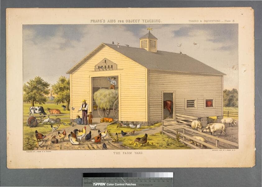 Image of a broadside advertising the auction of a farm in Doylestown, Pennsylvania, including land, buildings, livestock, agricultural machinery and implements, grain, and produce; images of barn and farmhouse, a cow, horse being led by a man, and pigs, surrounded by advertisement text.