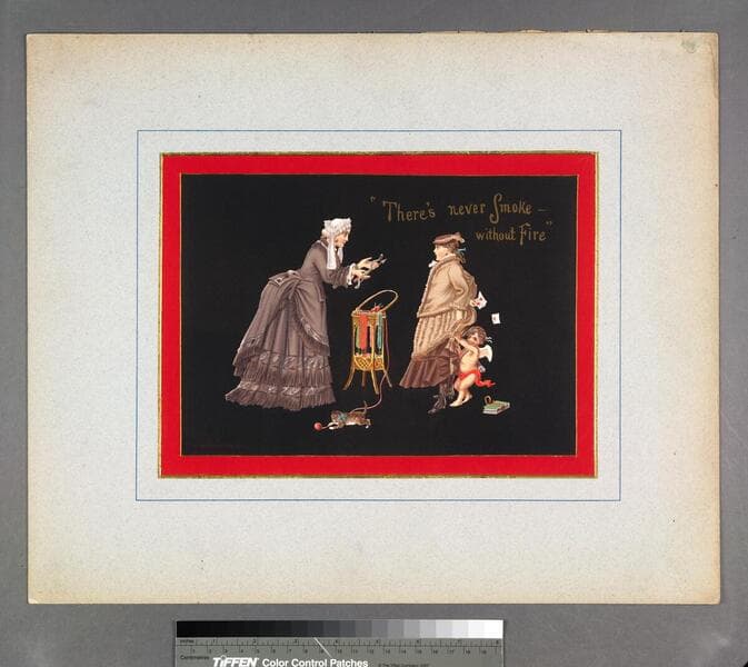 Image of a woman (likely meant to represent Venus) standing on a bed of roses being pulled by a pair of doves accompanied by baby Cupid in the folds of her mantle holding a notched bow and arrow in an advertisement for Prang's Valentine's Day greeting cards.