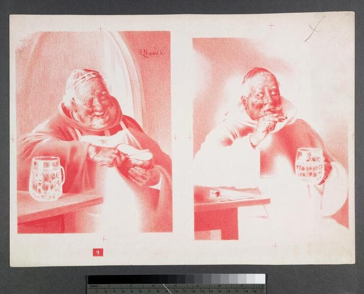 - Image of a proof sheet for two prints of seated monks, one slicing a wheel of cheese and the other with a glass in his hand.