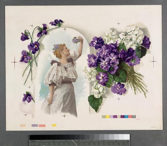 - Image of violet flowers in a bouquet and scattered along an archway with a woman visible beyond gazing up at the flowers she holds in one hand.