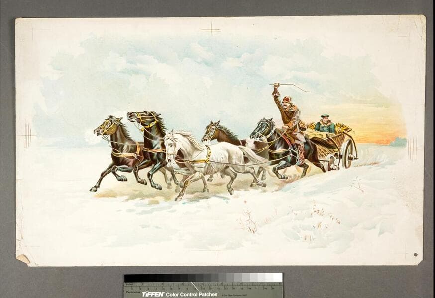 Image of a stock advertisement for Eskimo Muff Work's foot muffs; a man wrapped in furs and wearing fur foot muffs holds a whip in one hand and rides on a sled pulled by dogs across a frozen landscape; a red fur foot muff is visible several feet away from the sled in the foreground.