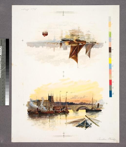 - Image of a proof sheet for two British cityscapes featuring barges on the River Thames and London Bridge.