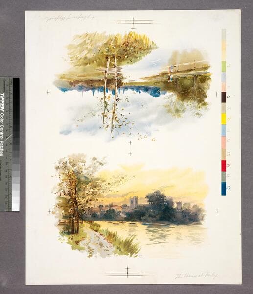 - Image of a proof sheet for two British landscapes featuring a view of Oxford from the countryside and Henley along the River Thames.
