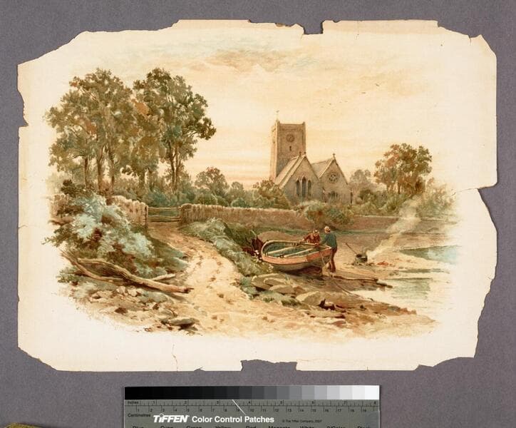 Image of a young man and woman courting over a low stone wall; near a tree with a field and trees beyond; woman wears a dress with apron and bonnet and stands near a watering can and a bush full of flowers in an advertisement for Crosman Brothers of Rochester, New York.