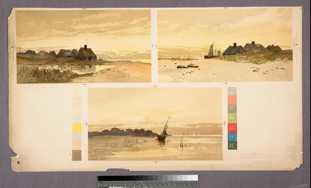 - Image of a proof sheet with three landscape views of sailboats or houses by sea, identified as being in Cape Ann, Vineyard Haven, and Martha's Vineyard, Massachusetts.
