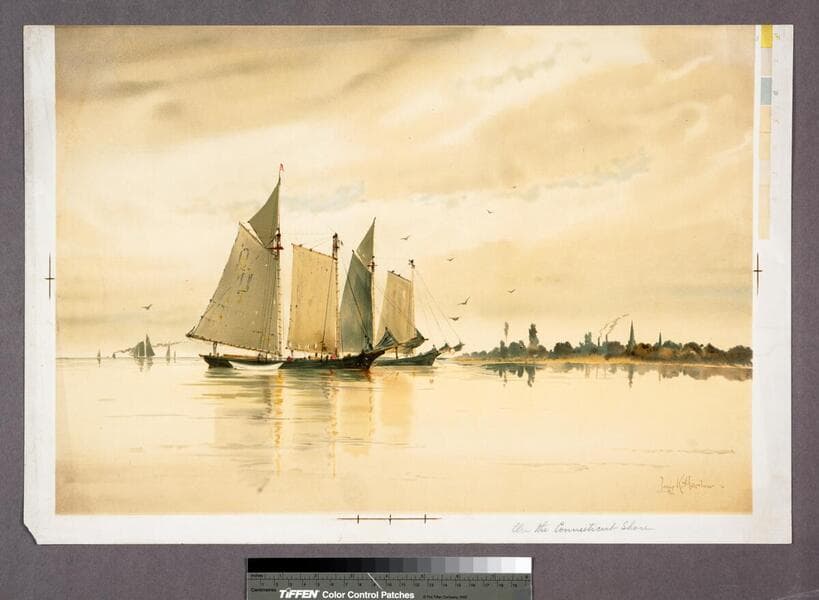 - Image of a cluster of sailing ships at sea along a coastline in Connecticut.