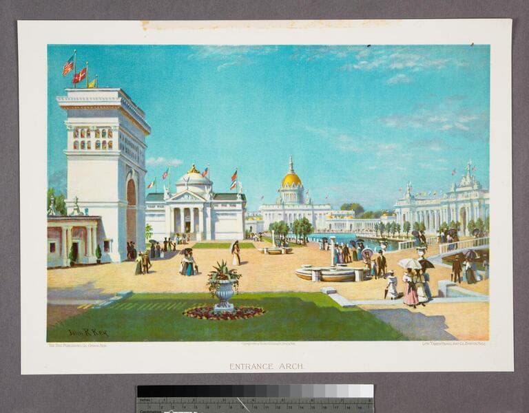 - Image of the entrance arch and other exhibition buildings with groups of people walking among them at the Trans-Mississippi Exhibition held in Omaha, Nebraska, in 1898.