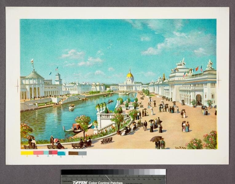 - Image of a lagoon with gondola boats between exhibition buildings at the Trans-Mississippi Exhibition held in Omaha, Nebraska, in 1898.