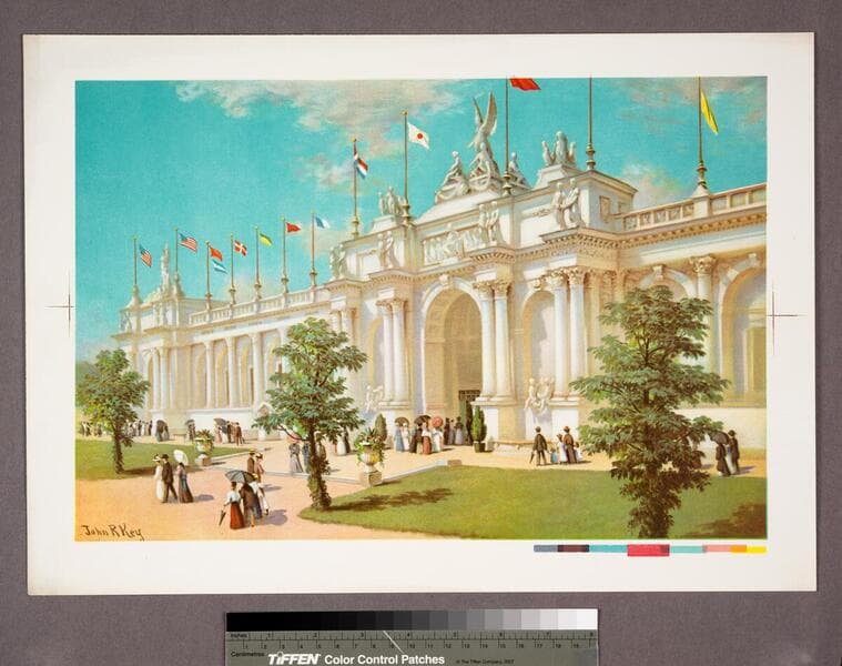 - Image of people entering the Agricultural Building at the Trans-Mississippi Exhibition held in Omaha, Nebraska, in 1898.