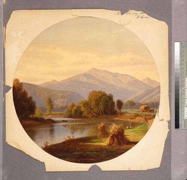 Image of a pastoral landscape near Farmington, Connecticut, with a cattle-drawn cart on a dirt road near a pond in foreground; hills in background extending beyond a row of dwellings.