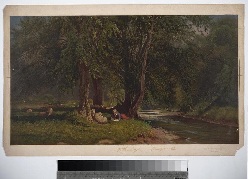 - Image of a pastoral landscape scene of a forest; a young woman lying under the trees reads next to a herd of sheep near a stream.