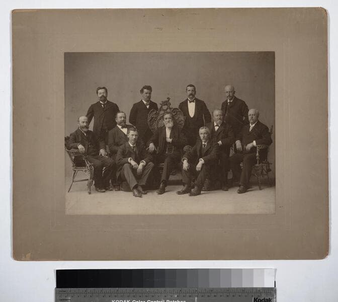 - Image of a group portrait of lithographer Louis Prang (seated, center) with ten other men.