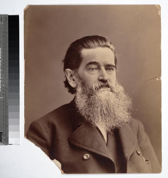 - Image of a bust-length portrait of lithographer Louis Prang with a full gray beard wearing a coat.