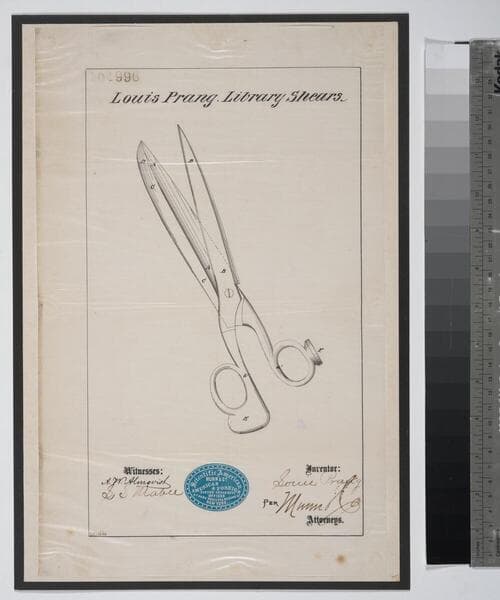 Image of a diagram of a pair of library shears for patent number "104996" invented by Louis Prang; signatures of witnesses, inventor, and patent attorneys Munn & Co. below diagram; letters patent certificate issued to lithographer Louis Prang for improvement in library shears affixed to verso.