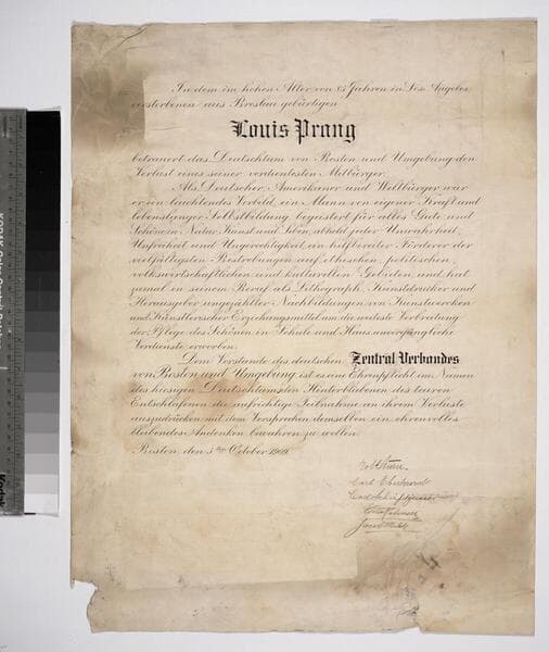 This series contains approximately 160 items related to Louis Prang's personal and business dealings. Letters, receipts, business records, letters patent certificates, memo and stock books, and a small number of photographs are included. Notable items include a certificate from a German association in Boston, Massachusetts, expressing their mourning over the death of lithographer Louis Prang (priJLC_PRG_002326), an L. Prang & Co. stock book full of handwritten notes and lists (Box 5, with photocopy of contents), a June 15, 1870, letter to Louis Prang from artist Albert Bierstadt praising the reproduction of his painting Sunset, and a series of letters from 1896-1898 in which Louis Prang writes to Max Levy regarding screen printing (Binder 10).