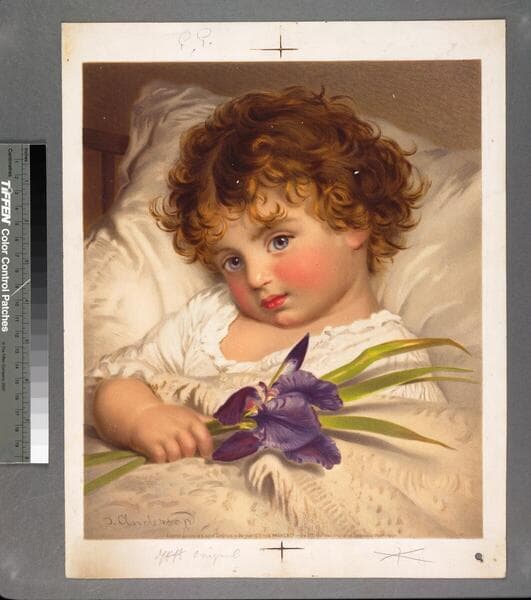 - Image of a small child in white tucked into bed holding purple iris flower in one hand.