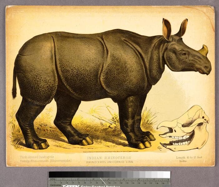- Image of a side view of an Indian rhinoceros; image of rhino skull inset at bottom right.