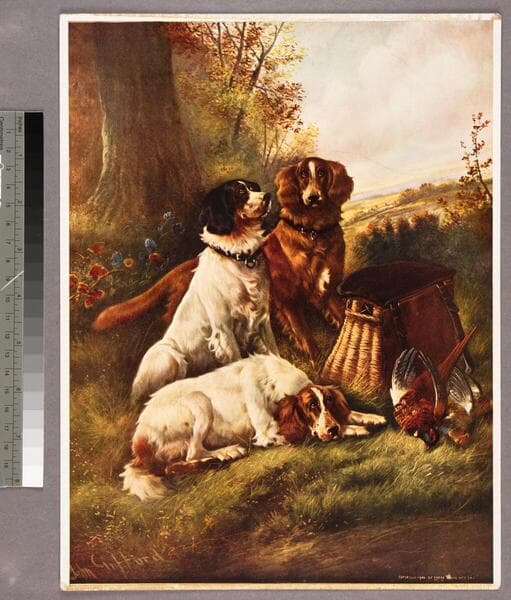 Image of a hunter standing with a rifle in hand looking towards a bird sitting on a branch; three hunting dogs stand ready for the hunt, one pointing under the bird in the tree; two small children perched on a wood fence look on, one with hands over her ears in anticipation of the gunshot.