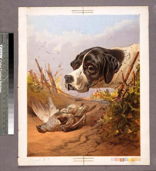 - Image of a black and white hunting dog looking down at a dead game bird on the ground.