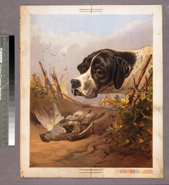 - Image of a black and white hunting dog looking down at a dead game bird on the ground.