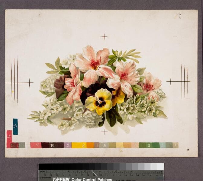 - Image of a bouquet of lilies, pansies, and small white blossoms.
