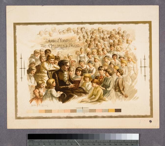 - Image of Louisa May Alcott sitting in a chair reading to a seemingly endless group of children of all ages clustered around her.