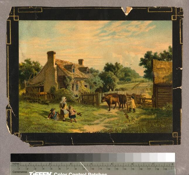 - Image of a house and barn with four children outside; one child opens a wooden gate to let several cows out to pasture; tree-lined dirt road leads off in the distance in background.