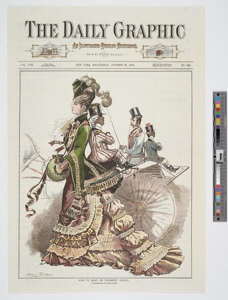 Image of a woman carrying a parasol/umbrella and wearing a floral hat and an elaborate dress with jacket bodice, overskirt with lace and bow detail, and long gathered skirt with bustle, ruffled hem and floral detailing; smaller image above of Atlas carrying the globe on his shoulders.