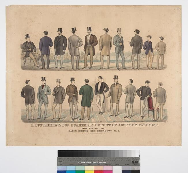 Image of four panels advertising Butterick men's fashions; center top panel shows elevated street view of Broadway in the city of New York with pedestrians and horse-drawn vehicles, Butterick building visible at left; top right, top left, and lower panels feature men's day and evening wear, fashion details include tail coats, jackets, and overcoats, waistcoats, cravats, ties, suits, and trousers for men and boys; accessories include porkpie and top hats, canes, and gloves; reference key for figures numbered 1-23 with letter designations.