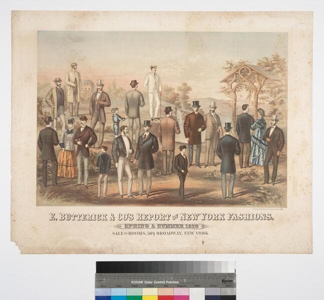 Image of an indoor vignette advertising Butterick fashions for men and women; fashion details include full skirt with tiered overskirt and banded edges, fitted bodice with wide sleeves, men's jackets, overcoats, waistcoats, ties, suits, and trousers; accessories include bowler and top hats, canes, floral hat, fan, and gloves; reference key for figures numbered 1-6 in bottom margin.